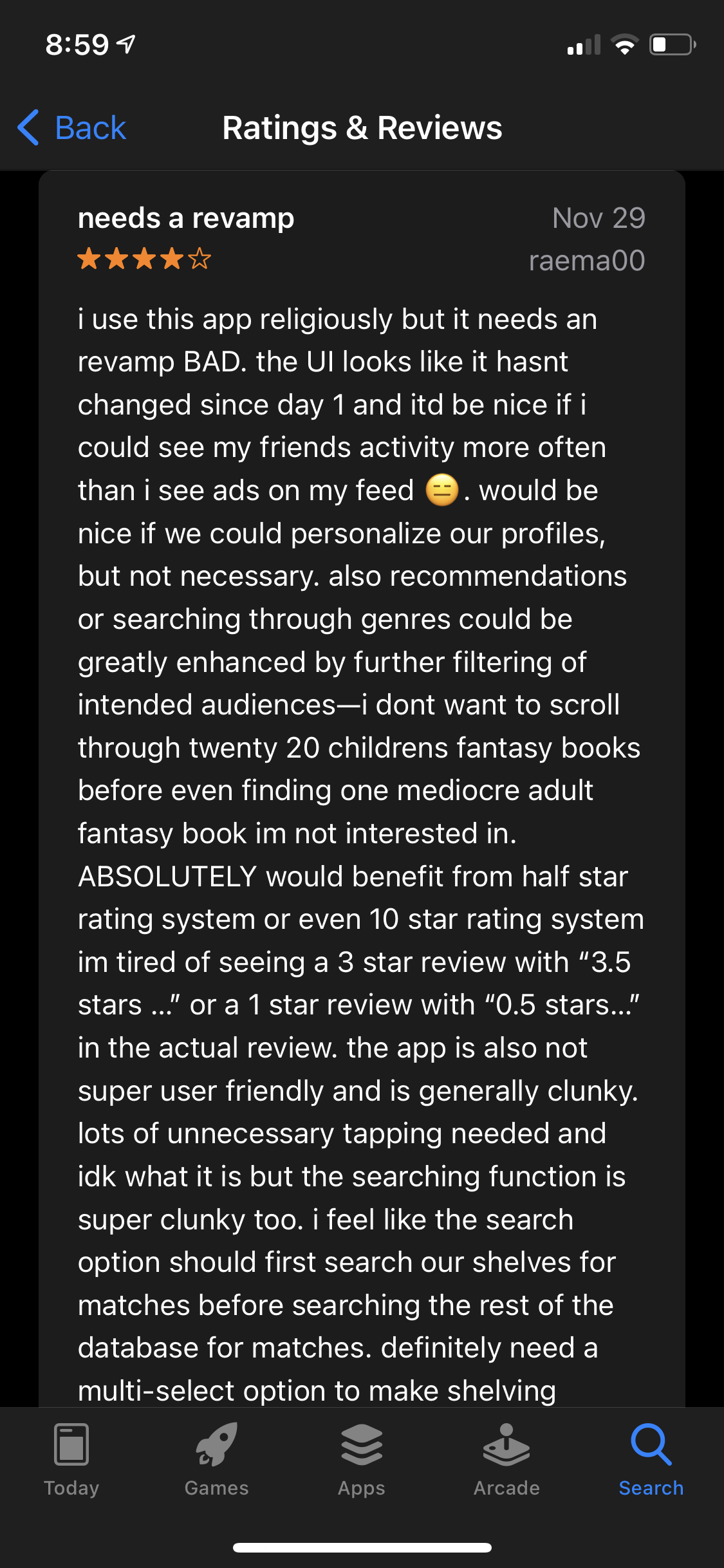 A main motivation behind using a book review app would be the social process. This might be from seeing others’ reviews, seeing friends’ reviews, or connecting with others who have similar interests.