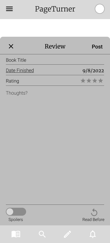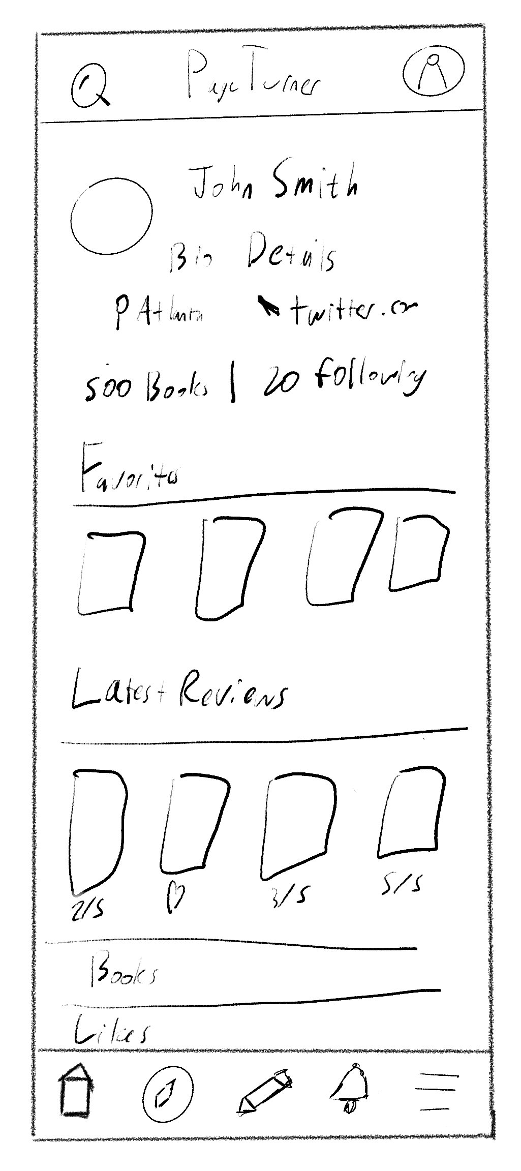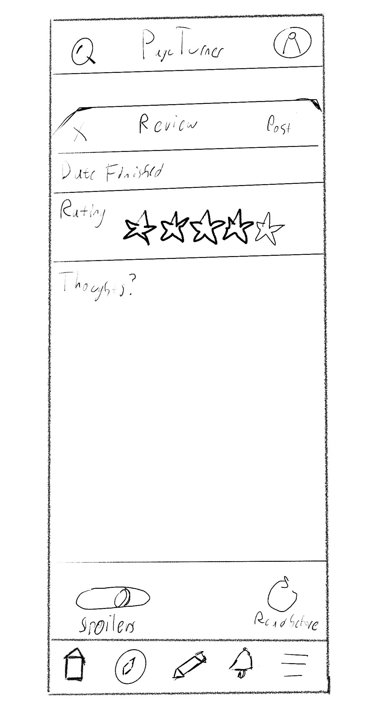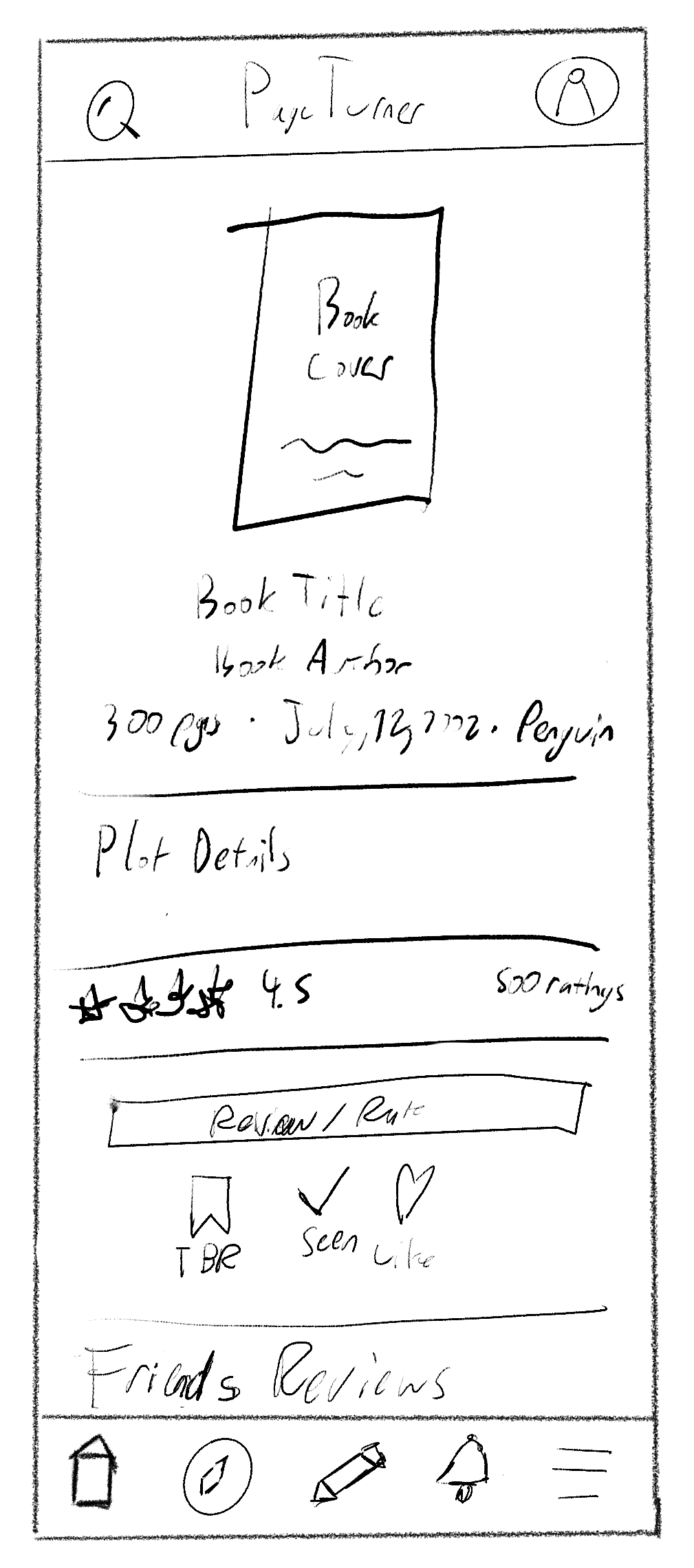 This is a quick sketch for the review pop-up screen. I felt the review portion didn’t need to be its own separate “page” but could be a quick write-up for the user to add to or edit as they wished. In addition to a rating and write-up, I felt it might be useful to add a spoiler tag so users did not feel restricted in what they talked about. Additionally, I added a “Read Before” button for more frequent readers to indicate that they’re rereading a book, in case they wanted to indicate a new perspective.