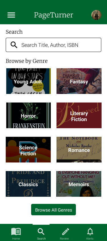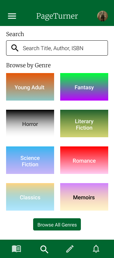 For the search page, I received feedback that the gradients feel slightly removed from the overall design of the app. I decided to instead choose books that serve as representative examples, as I also felt that the gradients came off as a bit clashing with the other colors. The book background serves to add uniformity and gives readers an idea of what each genre is about.