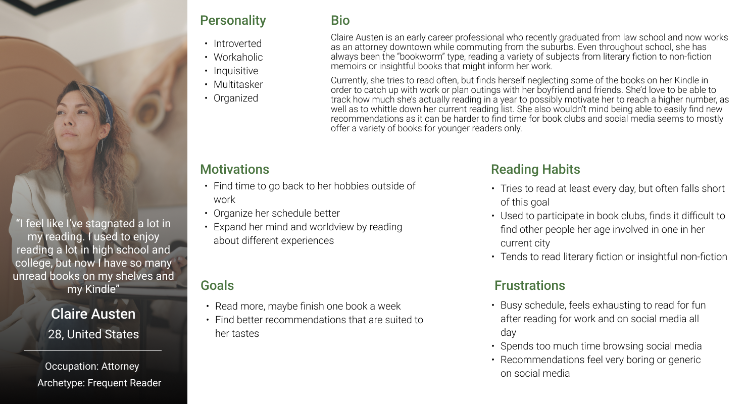 Based on my research and user interviews, I formed provisional personas based on the “voracious reader” and the “casual reader”. While both might use a book review app, both will have different purposes in mind. The voracious reader may use it to find new books and comment on insightful reviews, while the casual reader might use it as motivation to read more. My user persona focuses on a mix of these, highlighting a persona that might be very into literature, but whose hobby has fallen by the wayside in a busy world.