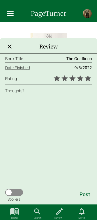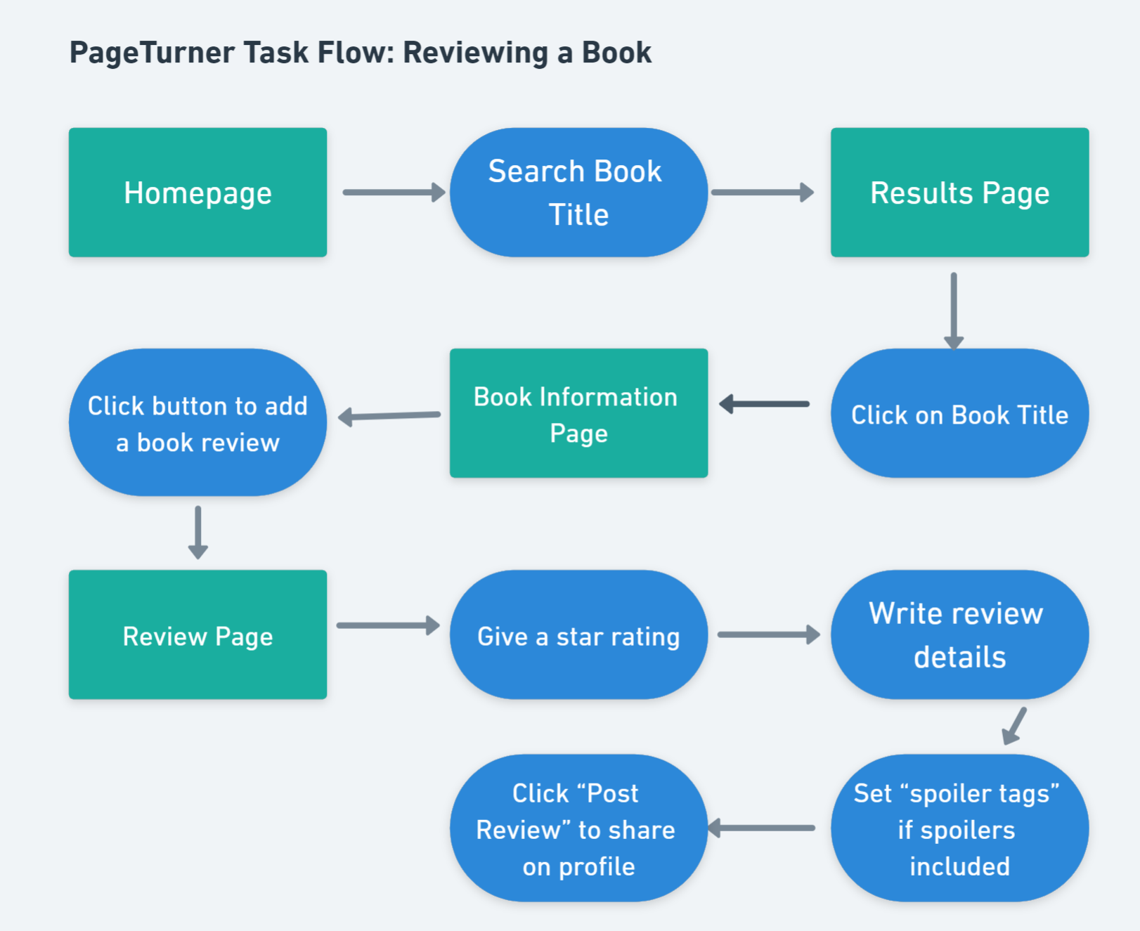 Given that PageTurner is a book review app, I wanted to make that the main focus and ensure that the flow for this task was simplified. To work through this, I analyzed other flows from existing media review apps to see all variations and options a user could go through to review a novel/movie/song before arriving at my final task flow.