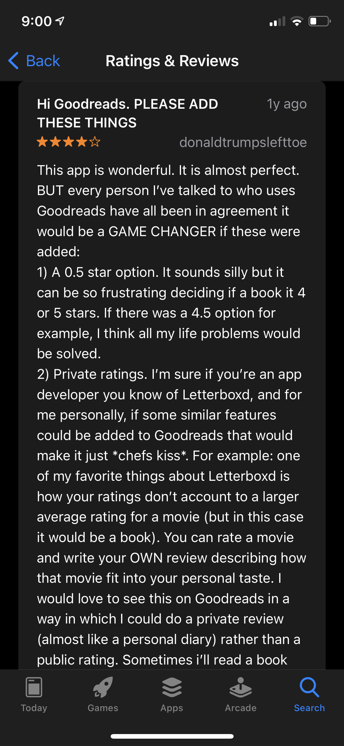 Goodreads, as an app, is rated quite highly on the Apple store at 4.8/5. Despite this, some top reviews still have some critical comments, mostly pointing out the lack of good recommendations, the lack of a proper tagging system, the lack of half stars in reviews, and the need for private ratings or profiles. One user even points out that Letterboxd, a film review site, takes Goodreads concept but makes it better.