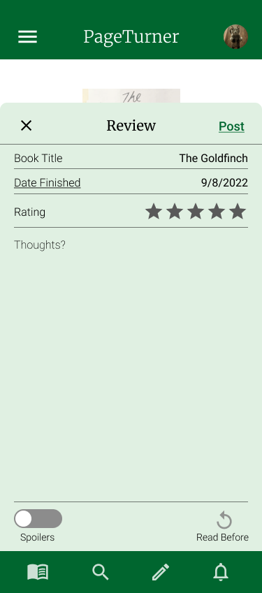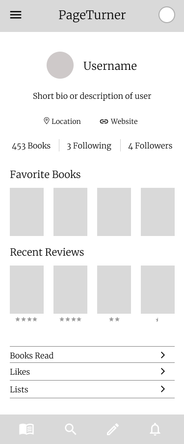 For the testing phase, I recruited four users from the age range of 20s-30s, all located in the USA. The main objectives behind my testing were to see if users would be able to navigate the process of adding a book review, identify useful features, and identify any pain points or design flaws in this process.