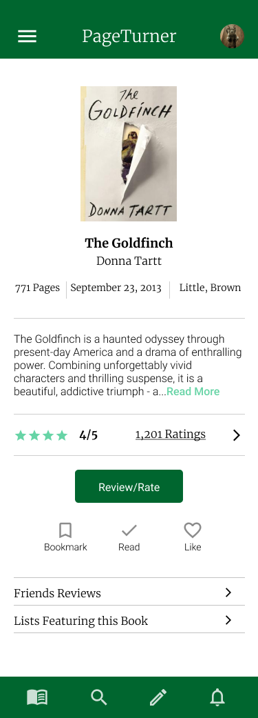 I’ve included a video which showcases the prototype for the main task flow of reviewing a book, involving a user navigating from the homepage to the search bar, searching up a book, landing on the book’s page, and then typing up a review and rating. I’ve also included a link to the original prototype on Figma as well as some separate screens.