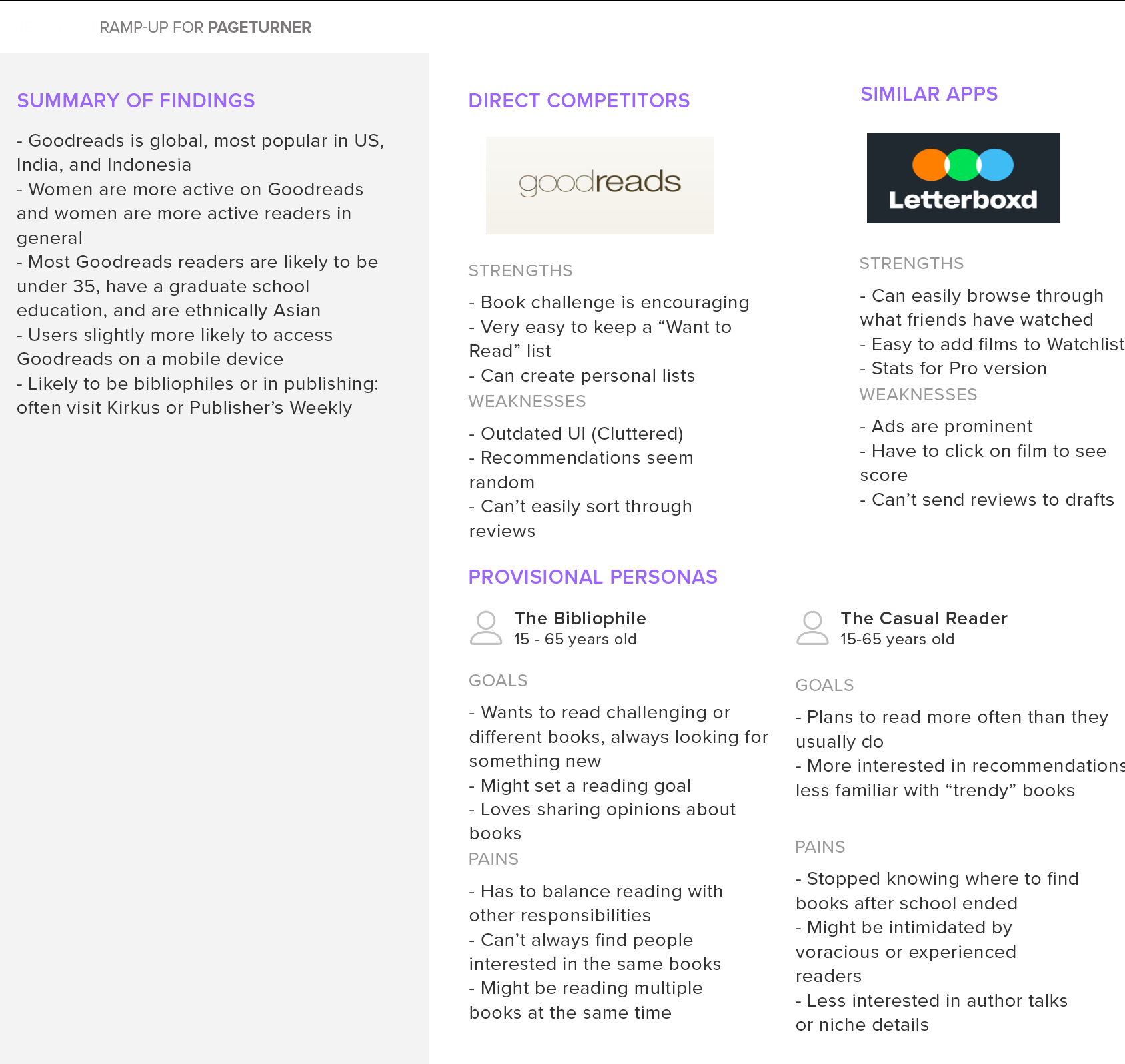 Some key findings from this involved focusing on Goodreads’ cluttered UI and seemingly random recommendations. Additionally, I formed two provisional personas based on the idea or theory that most people who use a book review app would be either frequent readers or casual readers.