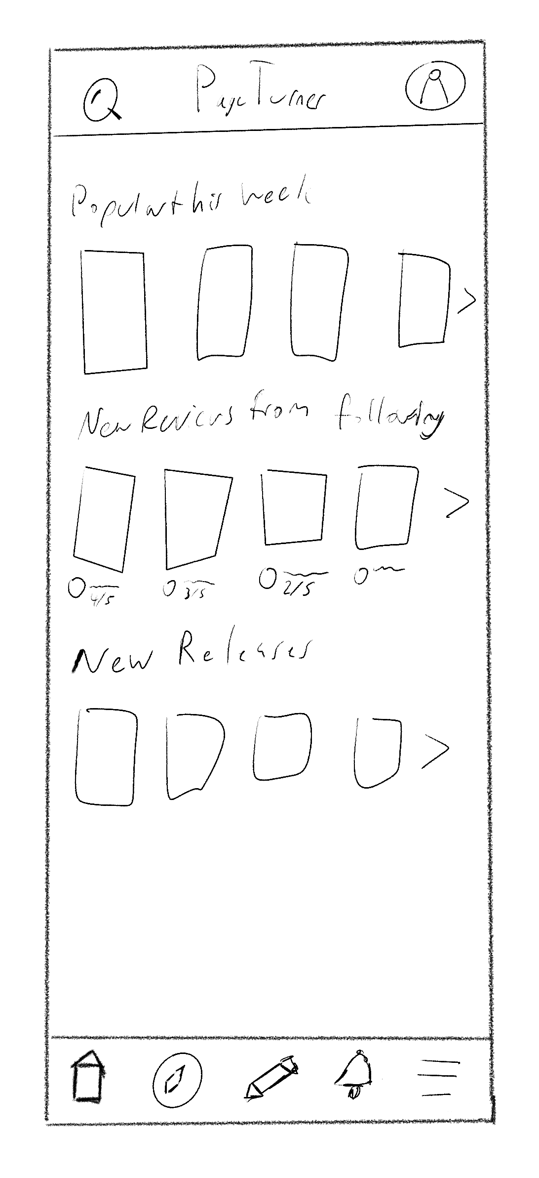 Initial sketches made on Procreate showcasing the homepage and navigation bar, a profile page, and a book’s specific page.